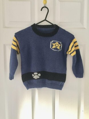 This jumper is a simple make. Worked bottom up with dropped sleeves and a crew neck. The hem, cuffs and neckband are worked in 1x1 rib. The jumper has a paw print motif and a badge motif. These are worked using the Swiss Darning/Duplicate Stitch method. There are several good tutorials available on the internet. You may prefer to work these motifs using the Intarsia Method. There are several colour choices and these are indicated in the pattern.