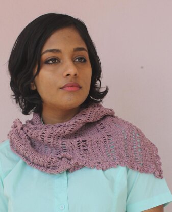 The lace body is worked sideways as an asymmetrical triangle. The ruffle of little petals along the lower edge and a delicate shell border on the wide end add a feminine touch.