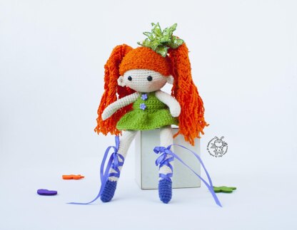 Materials needed • 2 mm hook (US hook 2/0 or C) • Cream and violet yarn “Gazzal XL baby cotton“ (55% Cotton, 45% Pac 105 m/50 g ) or Lana Grossa Ciassico color 20 and 42 ( 100% cotton 150 m/50 g) for doll. • Green yarn color 9623“Cascade 220 Sport“ (100% Wool 150 m/50 g) for dress • Orange colored yarn « Red Heart Scrubby Solids» 100% Polyester 84 m/92 yds (100 g/3,5 oz) for hair • Plastic tube length of about 10 cm. (For attachment of the head, neck and body together) • Toy stuffing • Plastic eyes or 2 buttons for eyes • 3 Buttons for the dress • Stitch holder • Tape L- 1 m
