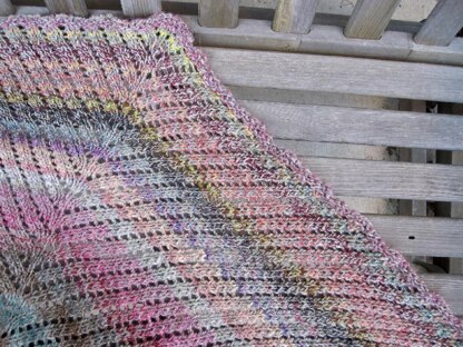 The shawl is worked from the bottom tip up with a simple angled lace pattern. Because the increases are located along the center spine, the finished shape is like a squat diamond that results in a shawl collar when worn. This version has a lightly ruffled border along the top, but you could work that straight if you choose. This pattern works equally well in a finer yarn and at multiple sizes; let the spirit of the sampler box guide your knitting!