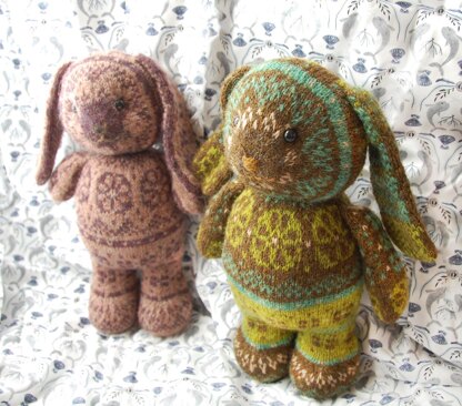 This is a pattern for a stuffed rabbit toy worked using the Fair-Isle knitting technique. It is worked from the feet up and in the round, in 6 pieces, and with embroidery detail over the face. You may work it in 4 or more colours or simply 2. Instructions are given for 4 colour rabbit, but additional charts for 2 colour rabbit are included. (both rabbits were worked the same, only the colours were changed to protect the innocent)