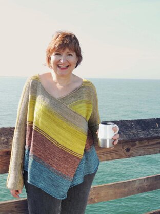 Ventura Pier in California, built in 1872, was the inspiration for this one-piece sweater wrap. Horizontal color bands drape the fronts and flow free like the ocean breeze over the planks and piles. It features the following delightful details: bell sleeves, clever uses of I-cord to finish the edges as you knit, and grafting to minimize finishing to only two seams. It can be draped open or worn with simple loop and button closures.