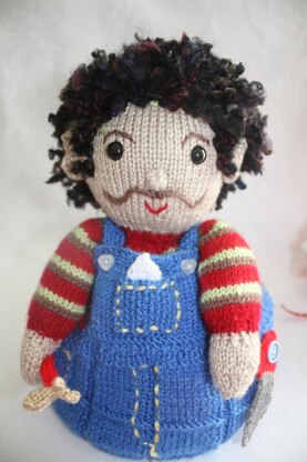 Pierre the Pajama Gentleman is a suave southern gentleman whose aim is to be the best friend of Penelope the Pajama Mama His overalls and sweater are knit in one piece with his head and then the arms are attached last. The pattern includes detailed instructions - with photos- to facilitate the easy assembly of this pajama bag. His overalls are plenty large enough to hold not only a young man's pajamas but also his prized treasures he wants to hide from the prying eyes of his sisters. The overalls are lined to prevent stretching. Pierre is holding his array of tools that any respectful southern gentleman must own. His hand saw, screwdriver, hammer and even a white kerchief are sure to make Penelope feel secure in his abilities to be her "handyman"! Knit in mainly Carons Simply Soft Light yarn, Pierre sports a Patons Silk and Bamboo head and hands and boucle hair courtesy of Red Heart. His quirky hairdo can be styled as you wish when you recreate him for your favourite young man.