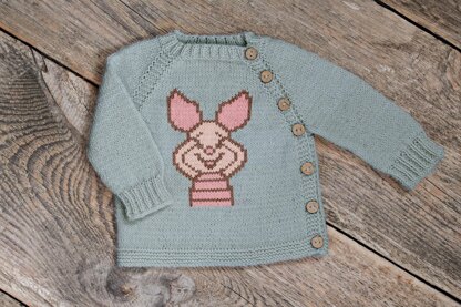 This beginner-friendly pattern helps you create a cozy, top-down baby sweater with Piglet embroidered on the front. The cardigan is worked in one piece from the neckline down, with raglan shaping and a charming asymmetrical front closure along the left raglan line. The pattern includes row-by-row written instructions, making it perfect for beginners or knitters who want step-by-step guidance. You’ll begin with neckline shaping using short rows, continue with raglan increases, work the sleeves flat, and then finish the body. Decorate the smooth stockinette with color Pig motif embroidery using duplicate stitch colorwork.