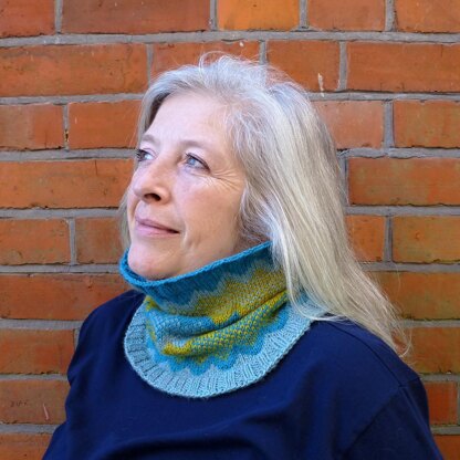 This cosy cowl uses a variation on the colourwork pattern from my popular Pimlico Socks, amended slightly to allow for three colours rather than two.