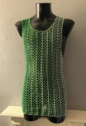 This crochet pattern is for a men's tank top in a mesh finish. The distinctive pattern is lines and bricks. The tank top is made sideways, so the vertical stripes are easy to make. You do not need to work out stitch counts as these are already calculated according to size.