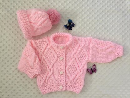 Size Guide: The pattern for a Hat and Cardigan and has instructions to fit 18″, 20″, 22″ and 24" chest. Knitted on straight needles.