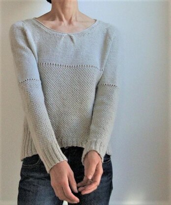 Placitas showcases a unique top-down construction with simultaneous set-in sleeves, featuring the slipped stitch, pleats and short row effect at front body withOUT working short rows.