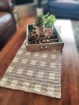 This Plain Checkers Farmhouse style table runner is customizable in length as well as types of yarn. All you need is a 5mm crochet hook and about 600 yards of yarn for a 35inch table runner, if you plan to use a worsted weight. You also need 3 different color yarns all the same weight.