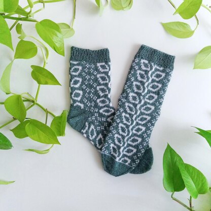 The sample shown is knit in size M for foot length EU 39 and uses Onion Sock yarn in approx 65 - 70g/2.46 oz-in MC (green) and approx 25g - 30g/1.05oz-in CC (white).