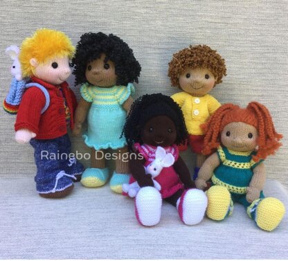 These darling Play Pal Dolls are knit in the round, using Magic Loop or double pointed needles. The legs, body, arms and head are knit on as you go along. Only the ears and hair are attached later. The underpants are knit on and there is an option to knit on socks. The larger doll (approx. 14” tall) is created using worsted wt. (Aran/10-ply) yarn and the smaller doll (approx. 12 ½” tall) is created using light wt. (DK wt.) yarn. There are directions for 5 hairstyles (curly, long wavy, short wavy, braids and eyelash), many items of removable clothing (pants, shorts, top, pullover, dress, jacket, and 2 kinds of shoe styles), and even a backpack with a tiny bunny for the doll to play with, included in this pattern. With their sweet faces and “little people bodies”, and all the hairstyle choices and clothing, it may even be possible to make a look-alike play pal for someone special.