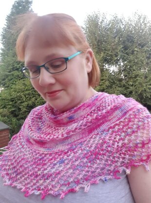It takes 323 - 395 yards (295 - 361 m) of 4ply/fingering yarn and if knit to the pattern gauge the shawl will be approximately 144 cm (57 in) wingspan, 39 cm (15.5 in) depth.