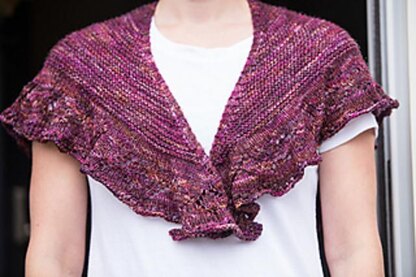 This crescent shaped shawl has a great shape that’s easy to wear, as it stays on without a shawl pin; it can work as a scarf and be draped in many different ways. It’s designed to use one skein (about 400 yds) of a solid, or semi-solid yarn. A larger size is provided as well, using 450 yds. Beginning with a center neck cast on, the shawl features 2 columns of yarn-over increases, plus increases at the edges. The first section is in garter stitch, so the knitter will see fast progress. The pretty lace edging ends in a narrow ruffled edge to complete the graceful feminine look.