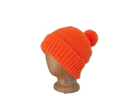 A fun garter stitch and rib hat topped with a pom pom, sized for children, women and men.