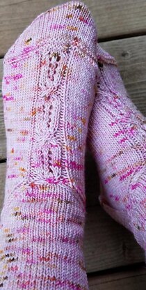 Pomegranate Wine socks are worked top-down in the round. There is a sweet lace and cable pattern that is worked on the sides of the leg, then moves to the top of the foot. A very classic, feminine sock.