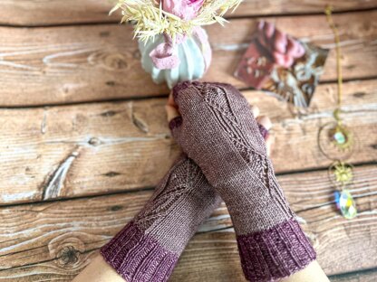 Mostly worked in stockinette stitch, they feature an elegant textured panel mirrored on the back of each mitt.
