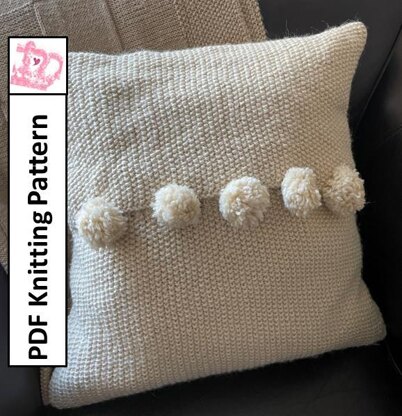 This easy to knit pillow cover is finished with fun pompoms for a great effect.