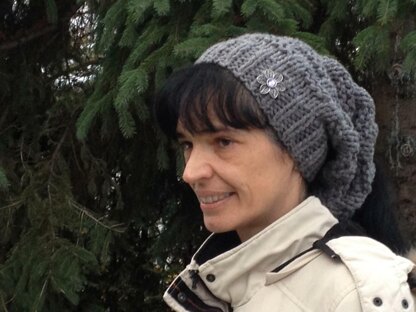 This hat is knitted in a very bulky yarn, this allows to knit it very quickly. It is’nt closed at the end to be able to spend her ponytail. Very useful for all those who will cap so like me!