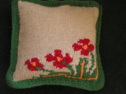 My Poppy cushion cover will fit a 30 x 30cm cushion pad. It is knitted in an aran thickness of yarn. The pattern comes with a grid that is easy to follow for placing the motif. The main part of the pattern is knitted in stocking stitch and the border is knitted in a moss stitch. The back fastens with buttons.