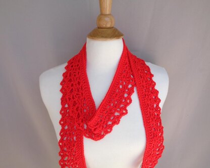A great way to get a feel for basic lace, or to use up some smaller balls in the stash. Try a dk or worsted weight with a larger hook to create a wider scarf.