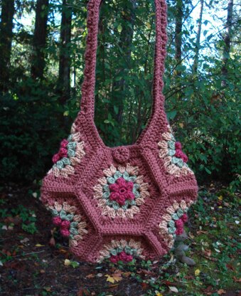 A crochet pattern for a sassy round bag created with hexagon motifs.