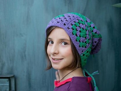 The hat is shaped seaming granny triangles and squares. The instructions will allow you to crochet a slouch or a beanie hat.