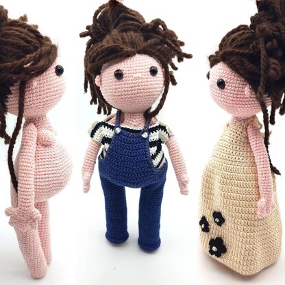 Amigurumi crochet pattern to make this cute pregnant doll and her pregnancy outfits ! Miniyou dolls were born back in 2019, when I went on a one month trip to Rwanda. At that time, the first prototype was named “Minime”, and I made her to be able to make photos of the trip without a seflie stick. I really loved making her clothes matching mine and giving her realistic poses on the pictures and I thought I would probably not be the only one enjoying making a smaller version of myself or any loved one ! That’s why I’m now making a “Miniyou” serie in which I hope a lot of crocheters out there will find their mini version. Pregnant Miniyou is the first Miniyou to get a pattern as I’m currently writing it with a 28 weeks pregnancy belly ! I made her with a maxi dress as well as overalls and a nursing T-shirt as I think they are pretty common as pregnancy outfits. It goes without saying that you can adapt the hair color and style as well as the oufit colors to better match yours !