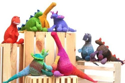 Whimsical, adorable, little dinosaurs, just the right size for little hands to hug. Four versions to knit in worsted wt singles, heavy worsted, or Aran wt yarns: Stegosaurus, Triceratops, Brachiosaurus, and Tyrannosaurus rex. Prehistoric Pals range in height from 6" to 10", seated.