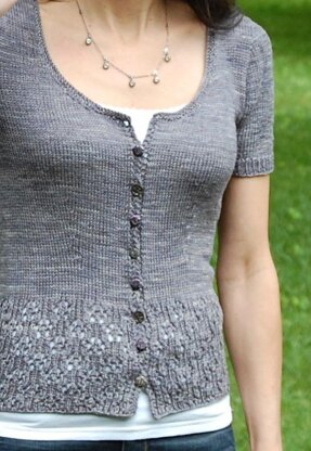 This pattern is the fingeringweight version of the Prescott DK cardigan. Worked from the shoulders-down, the set-in sleeves of the Prescott cardigan are created simultaneously with the upper bodice in a technique originally described by Barbara Walker. A photo tutorial is included with the pattern to illustrate the technique. The button plackets are worked along with the bodice, and allow you to place as many or as few buttons wherever you like without having to plan ahead. Shaping to the waist is accomplished along princess “seams” to allow for maximum customization. There is very little hip shaping, however, since the floral lace hem stretches to fit. See “Some Thoughts About Fit” section of the pattern for advice on how to adapt the shaping to your own fit preferences.