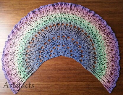 This is a fairly lacy design with a feature of rows of circles which look a little like peacock tail 'eyes' which, along with the self-striping Scheepjes Whirl yarn, give the shawl its name.