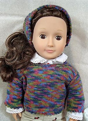 Picot edgings add a touch of spice to this little doll sweater and matching headband. Extra large neck opening and extended back opening makes it easier for a child to dress her favorite 18â doll. Sweater is worked in the round to the armholes, then flat to the shoulders. Sleeves are picked up and knit down to the cuffs.