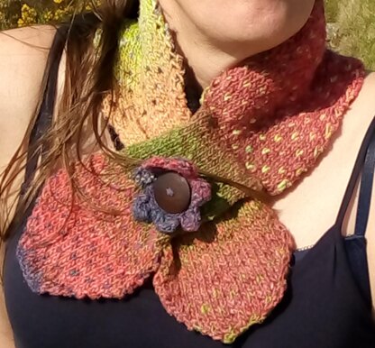 The scarf uses the "double knitting" technique, and uses a variegate yarn to show the effect off. It is finished with a knitted flower.