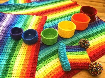This set is so sweet. YOU GET ALL THREE PATTERNS in USA and UK terms. Reversible crib blanket, hat (newborn to child sizes), and nesting baskets in primary colors.