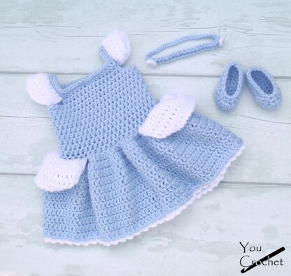 Directions for the headband, shoes and dress are included in 3 different sizes.