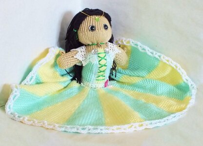 This project was done on a 54 and 36 peg loom with a 3/8" gauge CinDwood looms. I used Bernat Baby Yarn in size 3 in a mint and yellow yarn but only used about half of the skeins to do the doll. I used Caron Simply Soft for the skin tone and barely made a dint in the skein. I would say this is an intermediate pattern, it includes faux kitchener bind off, short rows, wraps and turns, color changes, peg stitch doubling, draw string bind off and cast on.