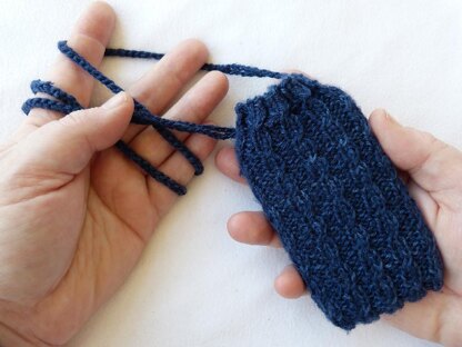 The drawstring is made using a small crochet hook and a single chain stitch. This gives a strong thin cord, that is constructed very quickly. Alternatively you could knit a cord. Yarn is held double throughout to get a 4 ply weight.