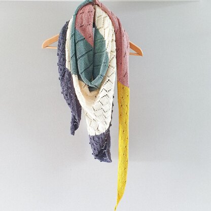 The Provence shawl is a simple triangle shawl, with regular increases on one side only, thus creating an asymmetric shape. The lace pattern grows gradually throughout the shawl, starting with smaller simple eyelets, growing into diagonal lines and finally diamond shaped patterns with bobbles at the center.