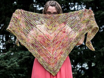 The result is a top-down triangular shawl with simple mesh lace, because that’s my summertime jam. Made to showcase the textural play between lace-weight mohair and sock yarn in the same magical colorway. Big bonus: I’m wearing this to Yarn Prom!