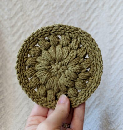 This pattern includes a lot of pictures to walk you through creating these great puff stitch coasters and how to block them.