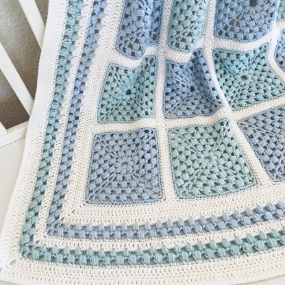 The Puffy Granny Square pattern is a new, textured take, on a classic pattern. The Puff stitch is easy and adds sweet little pillow-like stitches to this lovely baby blanket. The blanket has a generous five inch border, that spotlights your colors and the puff stitches, adding a stunning frame to the squares. The blanket pictured is 35 by 35 inches with worsted weight (size 4, medium) yarn. The size of the blanket is easily altered by the size of the yarn/hook used and the amount of squares worked.
