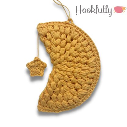 This crochet pattern is for a moon wall hanging made using the puff stitch. The moon measure 18cm high x 9cm wide. It makes a lovely decoration for kids’ bedrooms and babies nurseries.