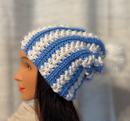 The Puffy Stripes Beanie is crocheted half double crochet and Puff stitches. Designed for worsted weight yarn, this makes up quick and easy, with simple size adjustments. Work in one color, or multiple colors with easy color changes that are hidden when finished. This beanie would look great in your favorite sports team colors!