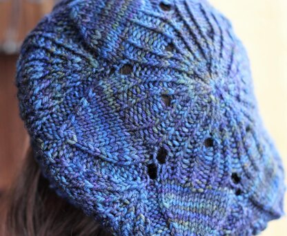 A flower forms the crown, incorporating eyelets and twisted stitches and is emphasized by diamonds of twisted stitches. The twisted ribbing finishes the hat smoothly. Like a doily, the hat is started from the center out. The shaping of the flower and the diamonds form the beret and make it look like one piece. Almost every row is different, which makes for an exciting knit with visible change every row. Instructions are included both in charted and written format (instructions line by line).