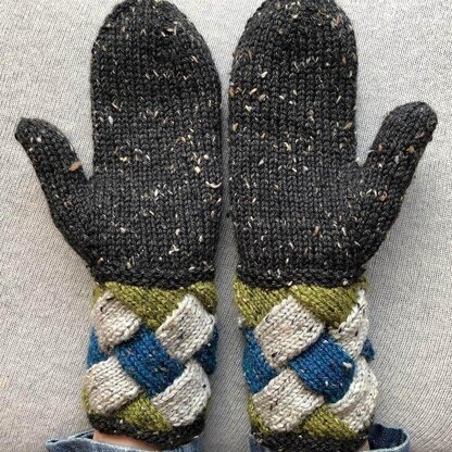 Did you know that covering the pulse points on your wrists is a highly effective way of warming up—because that warmed blood will circulate through your body? So, you might want to knit these brightly patterned cuffs and call it a day. Or you might make the whole mitten. Either way, you will have practised working entrelac in the round, and you’ll have warm hands. This is a great stash buster project since only small amounts of colour are needed.