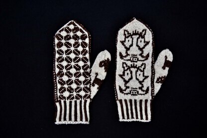 Warthogs are one of those animals that are so ugly, they’re cute! The also display two very charming behaviors: when they run, they stick their tales straight up, as if to say, “Follow ME!” (See it on the thumb!) And when they eat, they kneel on their front legs to get closer to the chow. I couldn’t help but immortalize them in these mittens, named for the Swahili word for warthog. A tribute to East Africa’s amazing coffee is featured on the palm.