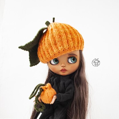 Pattern for knitted outfit includes a description of knitting pumpkin beret with leaf and handbag