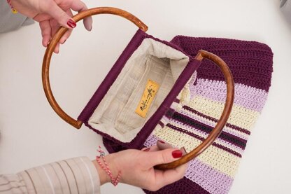 Materials needed: 4 colors of 100% cotton light worsted weight yarn, totaling approximately 150 g / 320 m / 350 yards, a pair of D-shaped plastic handles, about 16”/40 cm x 26”/65 cm cotton fabric for lining.