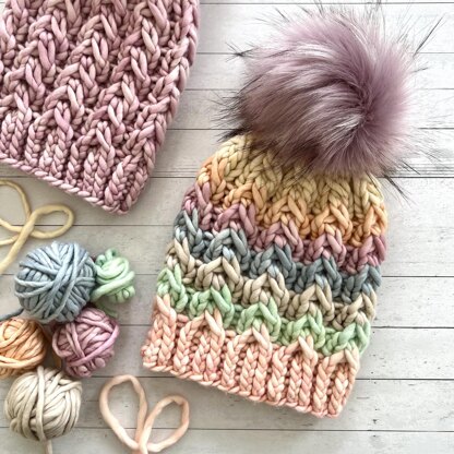 The Quartz Beanie is designed as a stash buster for your super bulky leftovers. Who doesn’t love using up every bit of yarn? This pattern is written with instructions to use 7 colors, so minimal yardage is required. Feel free to get creative with your color combinations or try to double up on repeats with less color changes. This pattern really is a blank slate. And, this design looks pretty in just one color too, so I have included instructions for zero color changes as well.