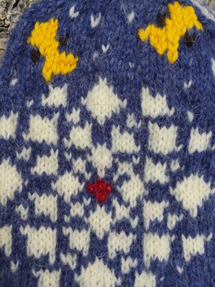 This mitten uses 2 skeins of Jamieson's #162, "Neptune" 2 skeins of #104 "Natural, about 20 yards of #365, "Chartreuse", and about 10 yards each of black, dark red, and yellow fingering weight yarns.