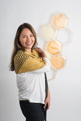 Honey Bee Wrap is an arrow-shaped wrap, pointy at one end and V-shaped at the other end. It is knit in sections (like a sampler shawl) with some easy, mindless stitches like garter and stockinette, and interspersed with interesting sections of bobbles, honeycomb lace and stripes.